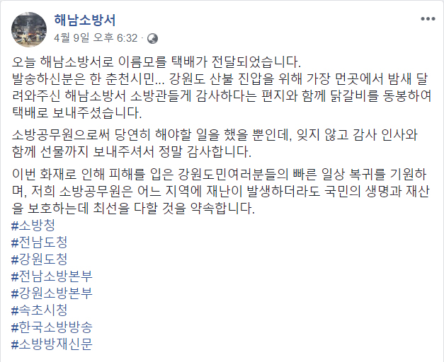 안녕하세요? 저는 강원도 춘천에 사는 시민입니다. 지난 주말 동해안 산불 진화에 애써주신 노고에 시민의 한 사람으로 감사의 말씀을 드립니다.