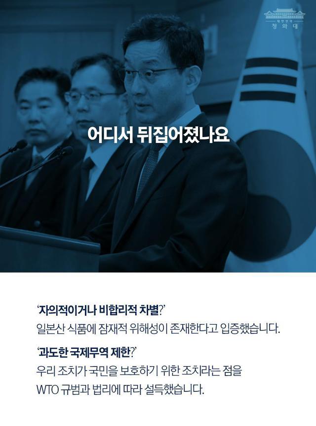 일본 수산물(후쿠시마 포함 인근 8개 현 수산물) 수입 규제 조치에 관한 세계무역기구(WTO)의 최종 판결에서 한국 정부가 1심을 뒤엎고 승소했습니다.WTO 상소기구는 1심 당시 일본 측이 제기한 4개 쟁점(차별성‧무역제한성‧투명성‧검사절차) 중 일부 절차적 쟁점(투명성 중 공표의무)을 제외한 사실상 모든 쟁점에서 1심 패널 판정을 파기하고 한국의 수입규제조치가 WTO 협정에 합치한다고 판정했습니다.이번 판정으로 한국의 일본에 대한 현행 수입규제조치는 변함없이 그대로 유지됩니다. 따라서 일본 8개현의 모든 수산물은 앞으로도 수입이 금지되고, 모든 일본산 수입식품에서 방사능이 미량이라도 나올 경우 17개 추가핵종에 대한 검사증명서도 계속 요구할 수 있게 됬습니다. 그렇다면 패소가 유력했던 이번 2심에서 한국이 승소할 수 있었던 이유는 뭘까요? 청와대는 아래와 같이 설명합니다.